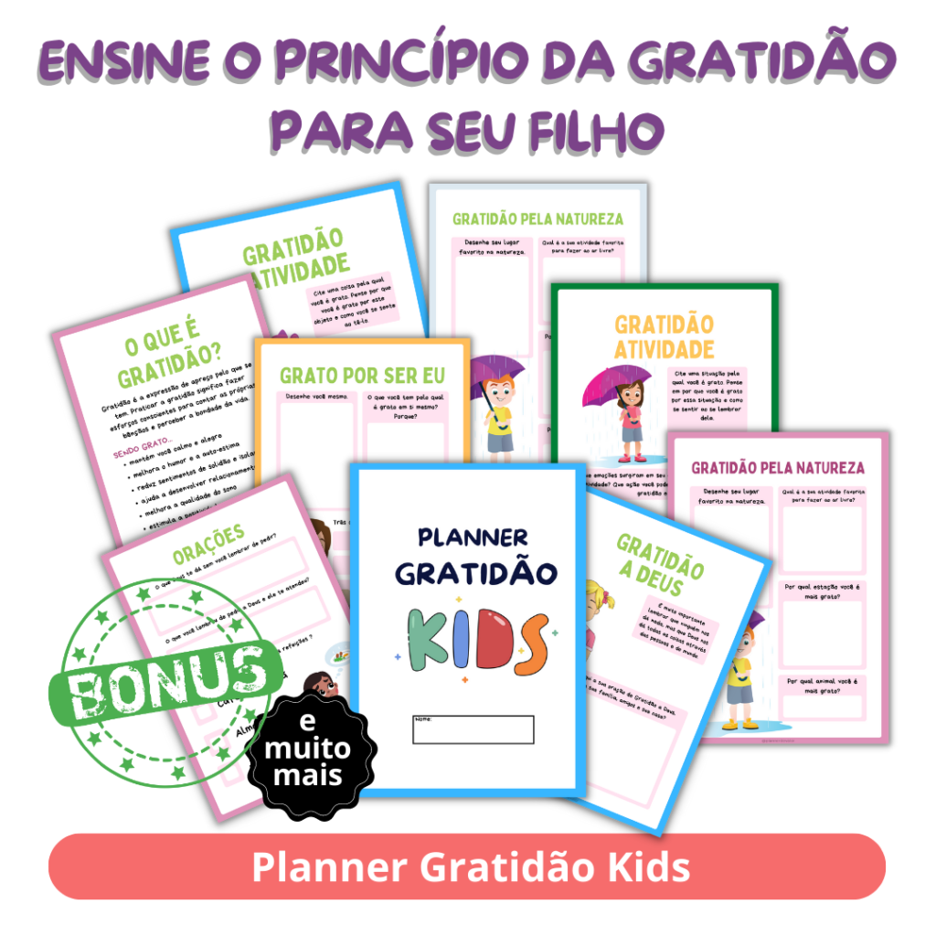 O Planner de Gratidão Kids é a ferramenta perfeita para ajudá-los a registrar e refletir sobre seus momentos de apreciação, promovendo uma visão mais positiva e contente da vida.